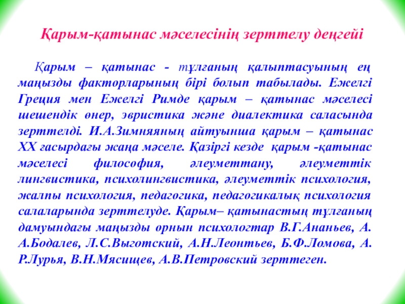 Слайд 9 Қарым – қатынас - тұлғаның қалыптасуының ең маңызды факторларының бірі
