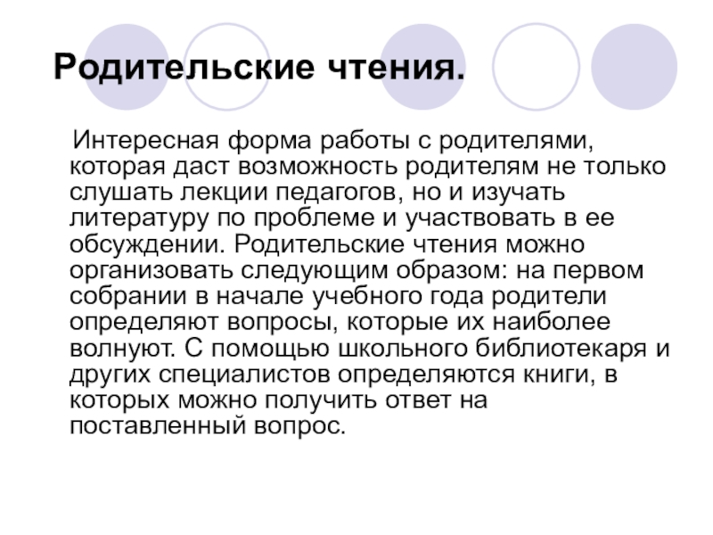 родителям не только слушать лекции педагогов, но и изучать литературу по проблеме и участвовать в ее обсуждении. Родительские чтения можно организовать следующим образом: на первом собрании в начале учебного года родители определяют вопросы, которые их наиболее волнуют. С помощью школьного библиотекаря и других специалистов определяются книги, в которых можно получить ответ на поставленный вопрос.