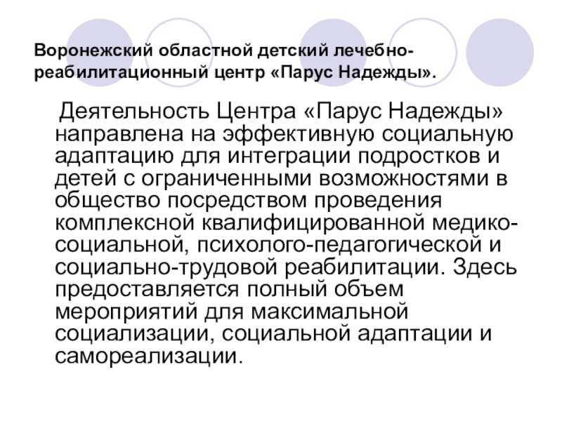 Слайд 10Воронежский областной детский лечебно-реабилитационный центр «Парус Надежды».