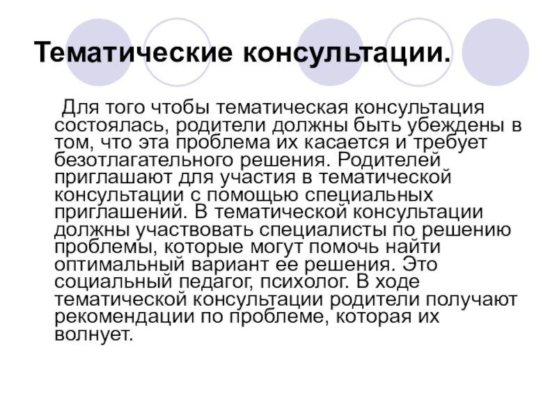 быть убеждены в том, что эта проблема их касается и требует безотлагательного решения. Родителей приглашают для участия в тематической консультации с помощью специальных приглашений. В тематической консультации должны участвовать специалисты по решению проблемы, которые могут помочь найти оптимальный вариант ее решения. Это социальный педагог, психолог. В ходе тематической консультации родители получают рекомендации по проблеме, которая их волнует.
