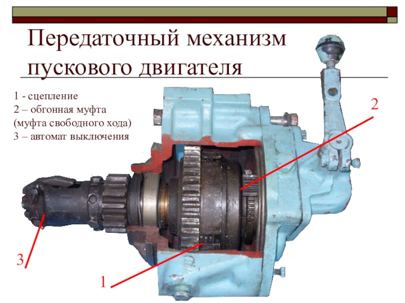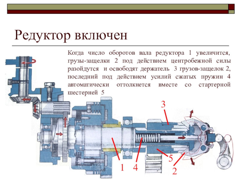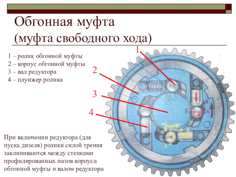При включении редуктора (для пуска дизеля) ролики силой трения заклиниваются между стенками профилированных пазов корпуса обгонной муфты и валом редуктора