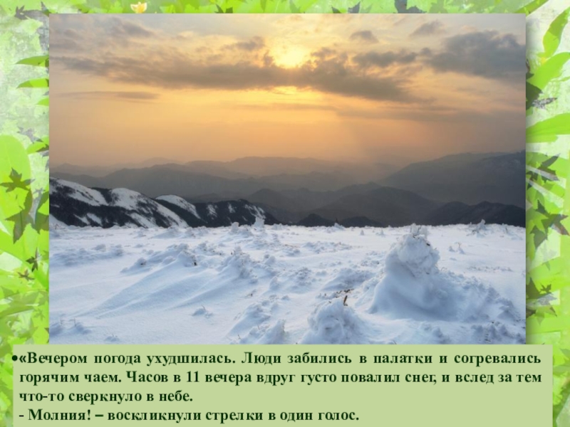 «Вечером погода ухудшилась. Люди забились в палатки и согревались горячим чаем. Часов в 11 вечера вдруг густо повалил снег, и вслед за тем что-то сверкнуло в небе.