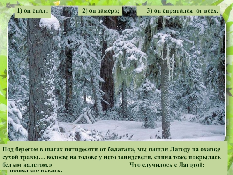 Под берегом в шагах пятидесяти от балагана, мы нашли Лагоду на охапке сухой травы… волосы на голове у него заиндевели, спина тоже покрылась белым налетом.» Что случилось с Лагодой: