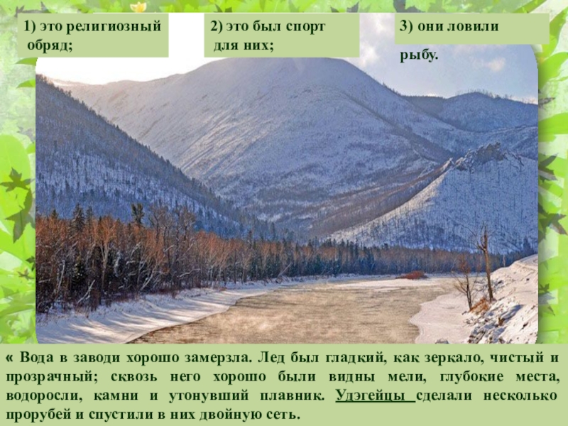 « Вода в заводи хорошо замерзла. Лед был гладкий, как зеркало, чистый и прозрачный; сквозь него хорошо были видны мели, глубокие места, водоросли, камни и утонувший плавник. Удэгейцы сделали несколько прорубей и спустили в них двойную сеть.
