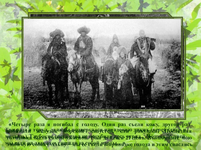 «Четыре раза я погибал с голоду. Один раз съели кожу, другой раз набивали желудок морской капустой, ели ракушки. Последняя голодовка была самой ужасной. Она длилась 21 день. Вы помните мою любимую собаку Альпу – мы ее съели в припадке голода и этим спаслись от смерти.