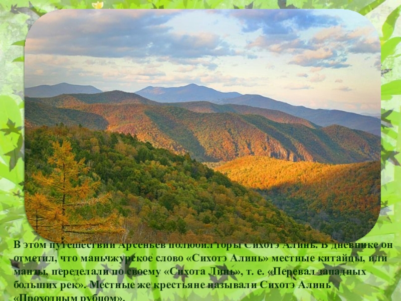 Арсеньев подметил, что «Хребет Сихотэ Алинь имеет громадное значение и в этнографическом, и в зоологическом, и в метеорологическом отношении, и с точки зрения флоры.