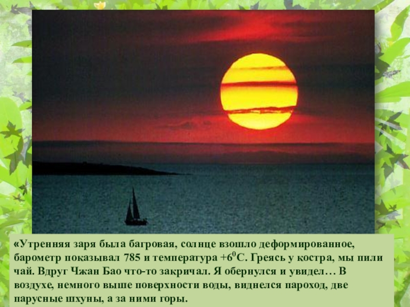 «Утренняя заря была багровая, солнце взошло деформированное, барометр показывал 785 и температура +60С. Греясь у костра, мы пили чай. Вдруг Чжан Бао что-то закричал. Я обернулся и увидел… В воздухе, немного выше поверхности воды, виднелся пароход, две парусные шхуны, а за ними горы.
