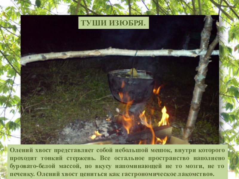 Олений хвост представляет собой небольшой мешок, внутри которого проходит тонкий стержень. Все остальное пространство наполнено буровато-белой массой, по вкусу напоминающей не то мозги, не то печенку. Олений хвост цениться как гастрономическое лакомство».