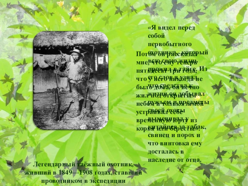 Легендарный таёжный охотник, живший в 1849—1908 годах, ставший проводником в экспедиции