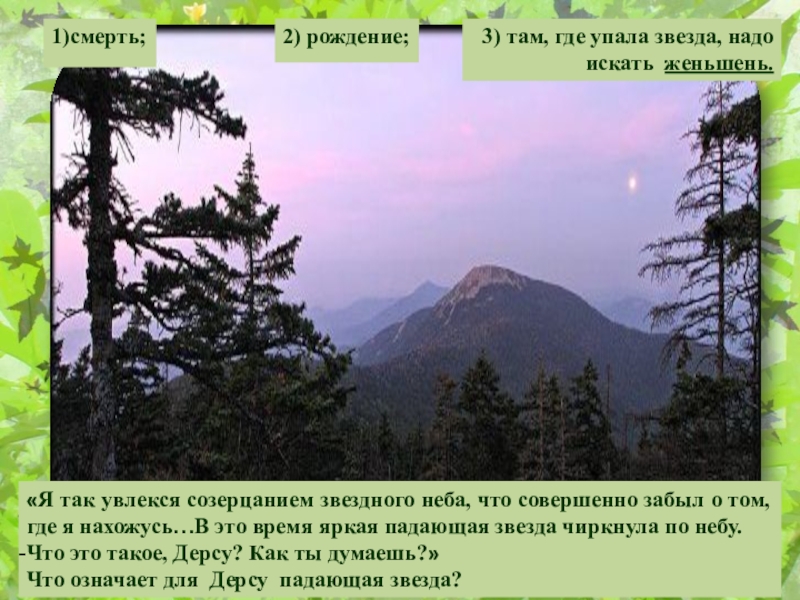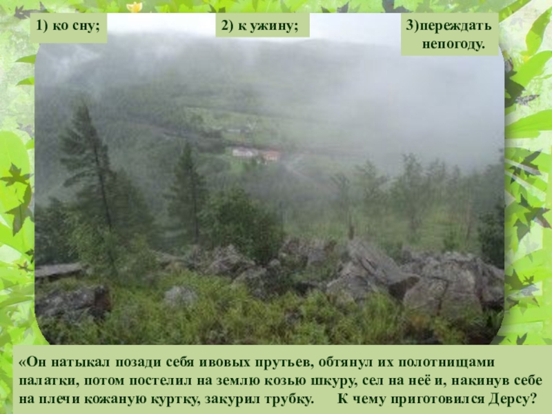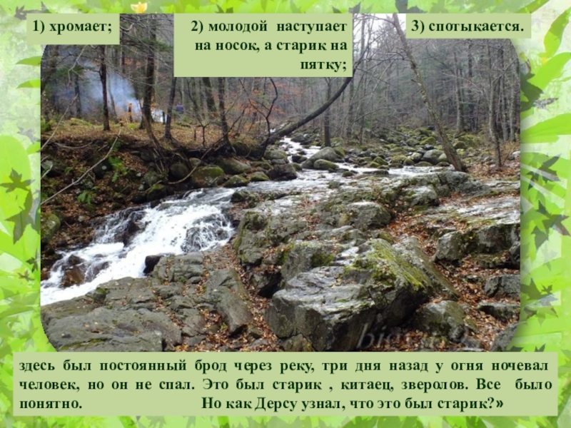 здесь был постоянный брод через реку, три дня назад у огня ночевал человек, но он не спал. Это был старик , китаец, зверолов. Все было понятно. Но как Дерсу узнал, что это был старик?»