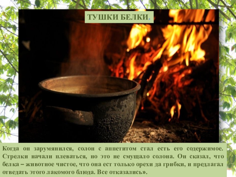 Когда он зарумянился, солон с аппетитом стал есть его содержимое. Стрелки начали плеваться, но это не смущало солона. Он сказал, что белка – животное чистое, что она ест только орехи да грибки, и предлагал отведать этого лакомого блюда. Все отказались».