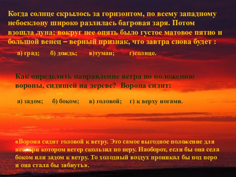 «Ворона сидит головой к ветру. Это самое выгодное положение для нее, при котором ветер скользил по перу. Наоборот, если бы она села боком или задом к ветру. То холодный воздух проникал бы под перо и она стала бы зябнуть».