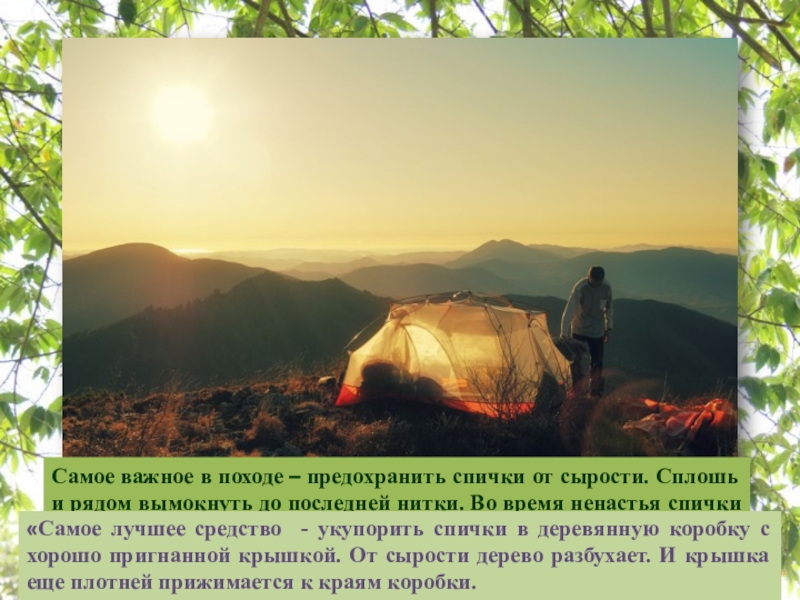 Самое важное в походе – предохранить спички от сырости. Сплошь и рядом вымокнуть до последней нитки. Во время ненастья спички не загораются даже тогда, когда они не были подмочены. Вы рискуете останется без костра, необходимого для согрева и приготовления пищи. Как сохранить спички сухими?