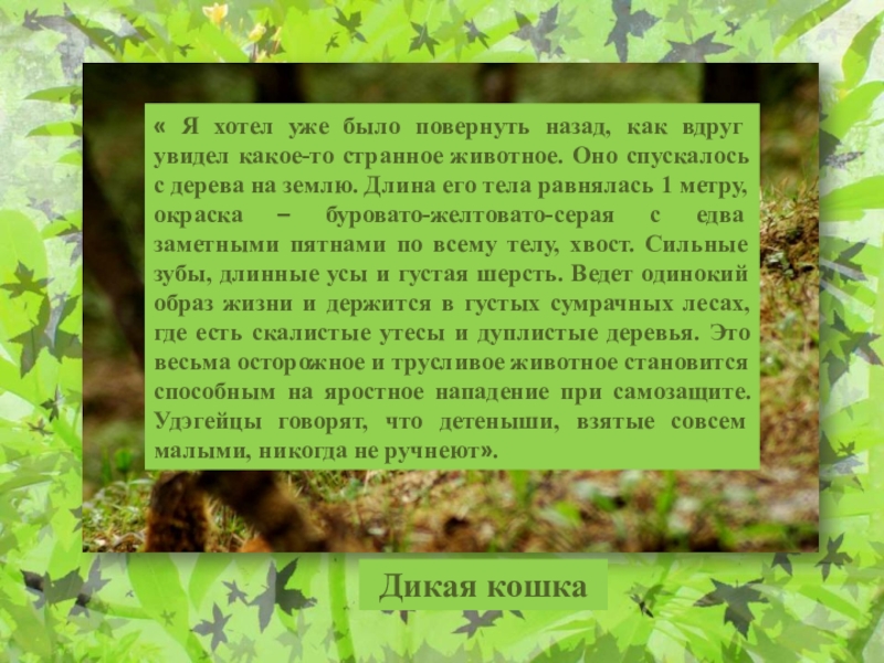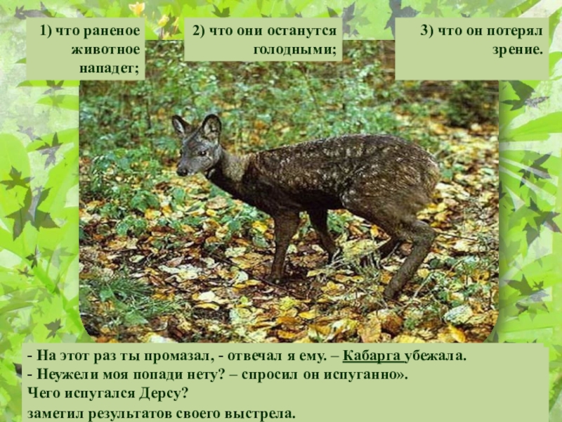 «Звук выстрела широко прокатился по всему лесу и замер в отдалении. Испуганная кабарга шарахнулась в сторону и скрылась в чаще.