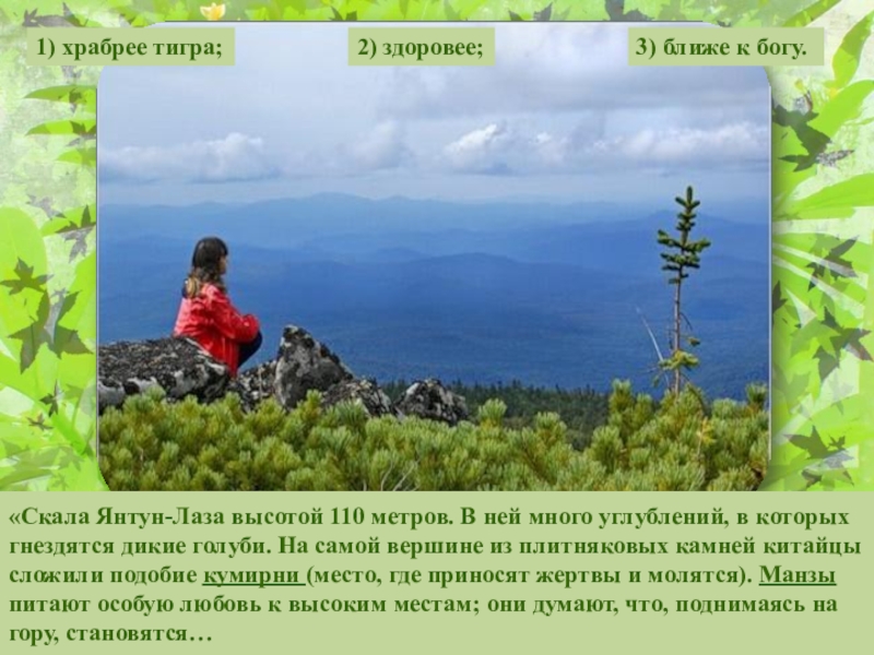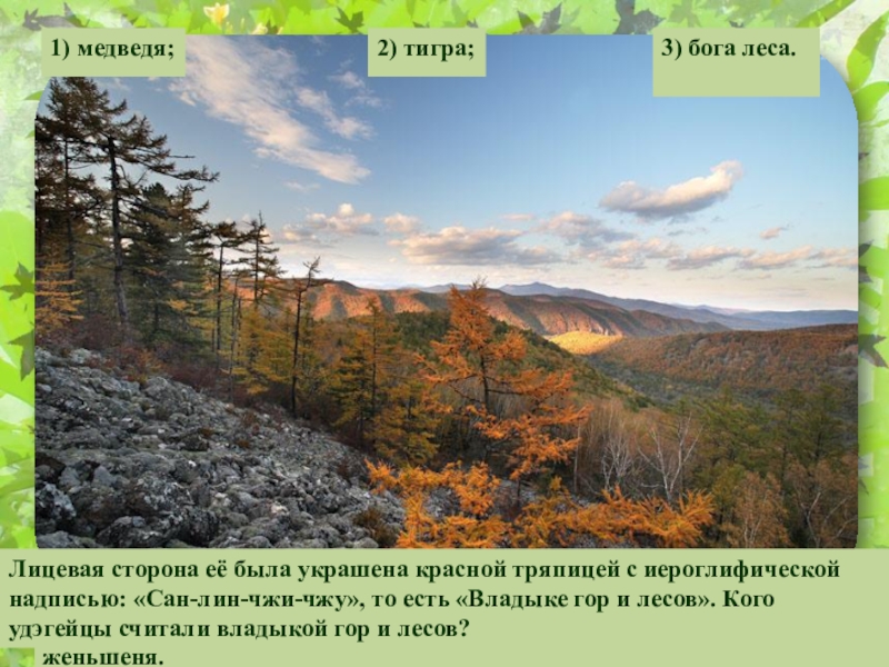 Лицевая сторона её была украшена красной тряпицей с иероглифической надписью: «Сан-лин-чжи-чжу», то есть «Владыке гор и лесов». Кого удэгейцы считали владыкой гор и лесов?