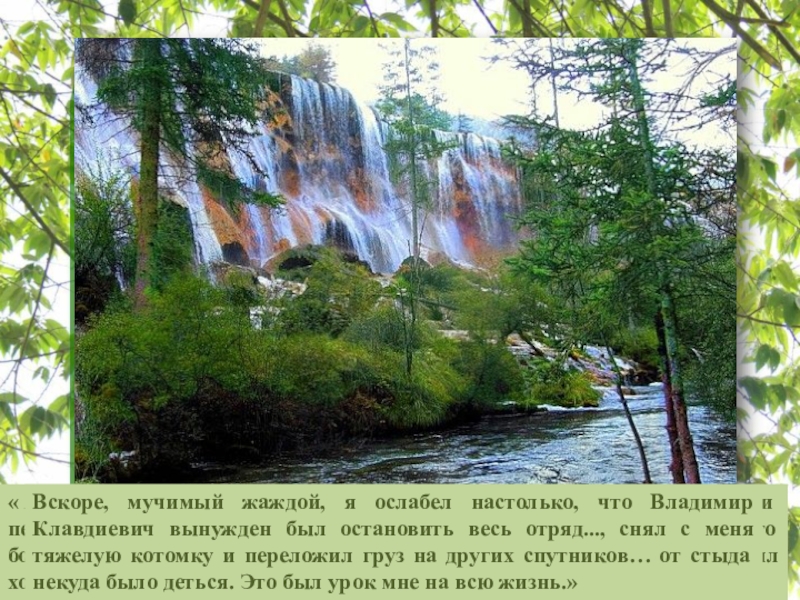 Вскоре, мучимый жаждой, я ослабел настолько, что Владимир Клавдиевич вынужден был остановить весь отряд..., снял с меня тяжелую котомку и переложил груз на других спутников… от стыда некуда было деться. Это был урок мне на всю жизнь.»