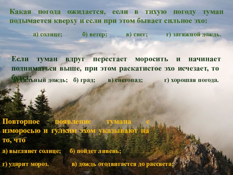 Если туман вдруг перестает моросить и начинает подниматься выше, при этом раскатистое эхо исчезает, то будет: