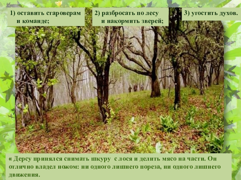 « Дерсу принялся снимать шкуру с лося и делить мясо на части. Он отлично владел ножом: ни одного лишнего пореза, ни одного лишнего движения.