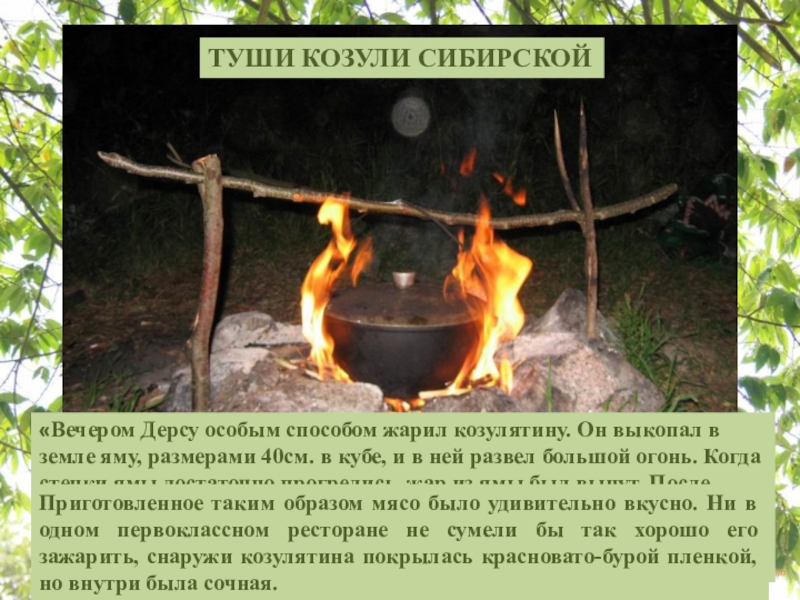 «Во время ужина я бросил кусочек мяса в костер. Увидев это, Дерсу поспешно вытащил его из огня и швырнул в сторону.