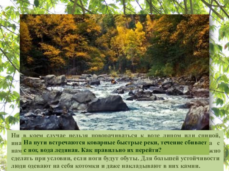 На пути встречаются коварные быстрые реки, течение сбивает с ног, вода ледяная. Как правильно их перейти?