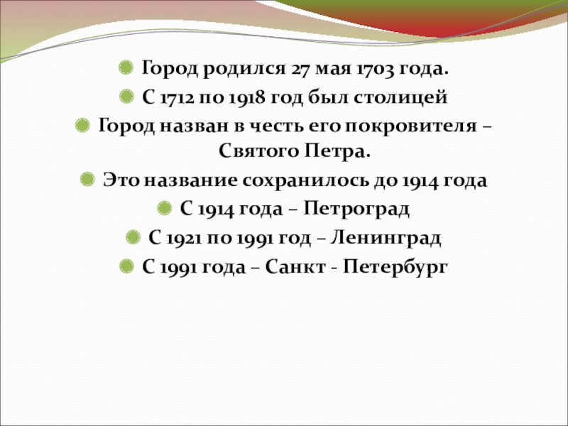 Город родился 27 мая 1703 года.С 1712 по 1918 год был столицейГород назван в честь его покровителя – Святого Петра.Это название сохранилось до 1914 годаС 1914 года – ПетроградС 1921 по 1991 год – ЛенинградС 1991