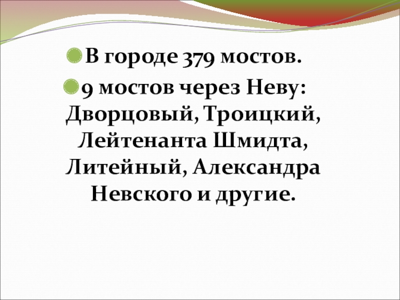 В городе 379 мостов.9 мостов через Неву: Дворцовый, Троицкий, Лейтенанта Шмидта, Литейный, Александра Невского и другие.