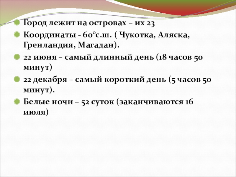 Город лежит на островах – их 23Координаты - 60°с.ш. ( Чукотка, Аляска, Гренландия, Магадан).22 июня – самый