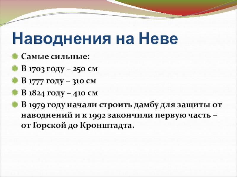 Наводнения на НевеСамые сильные:В 1703 году – 250 смВ 1777 году – 310 смВ 1824 году –