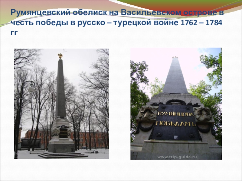Слайд 36Румянцевский обелиск на Васильевском острове в честь победы в русско –