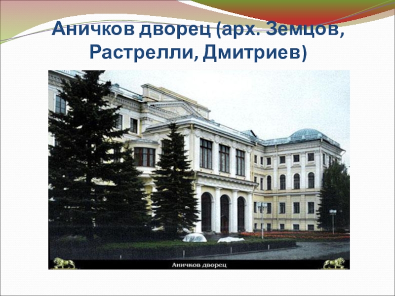 Слайд 23Аничков дворец (арх. Земцов,Растрелли, Дмитриев)