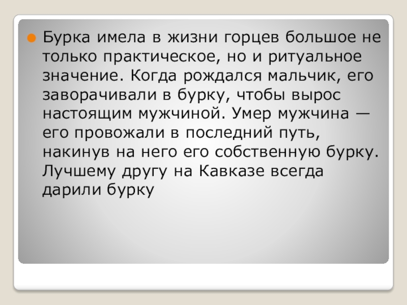 ритуальное значение. Когда рождался мальчик, его заворачивали в бурку, чтобы вырос настоящим мужчиной. Умер мужчина — его провожали в последний путь, накинув на него его собственную бурку. Лучшему другу на Кавказе всегда дарили бурку