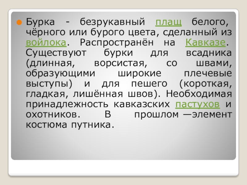 Слайд 2Бурка - безрукавный плащ белого, чёрного или бурого цвета, сделанный из