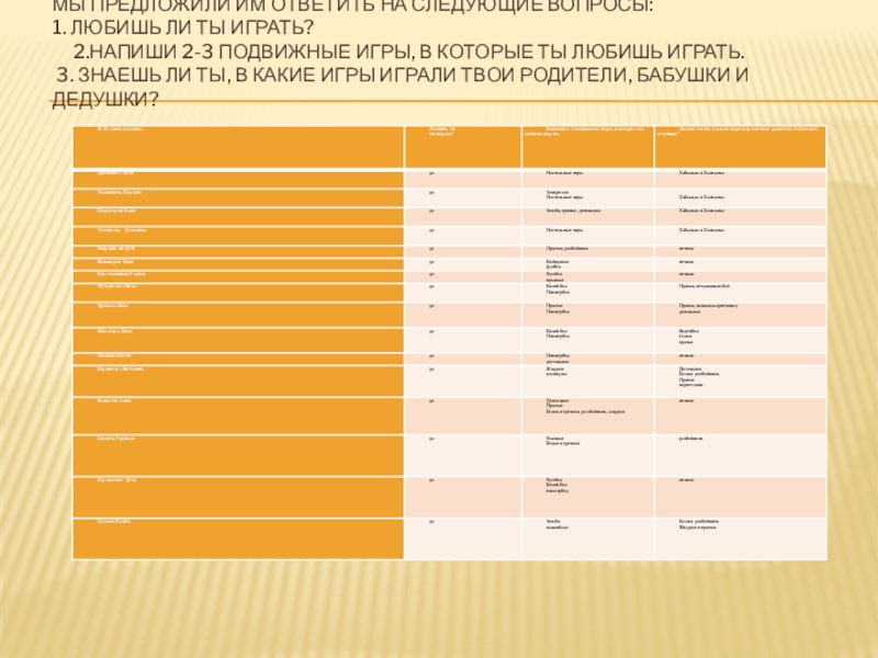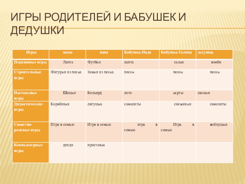 2) выявить, в какие игры любят играть наши сверстники и в какие игры играли мама, папа, бабушки и дедушки;