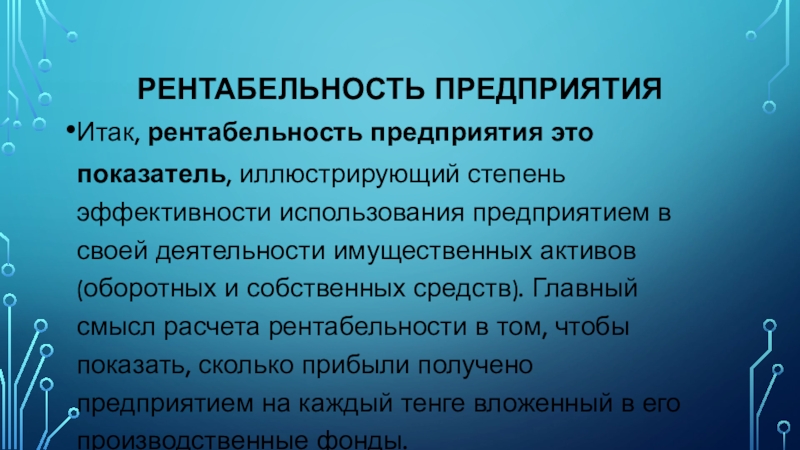 предприятием в своей деятельности имущественных активов (оборотных и собственных средств). Главный смысл расчета рентабельности в том, чтобы показать, сколько прибыли получено предприятием на каждый тенге вложенный в его производственные фонды.