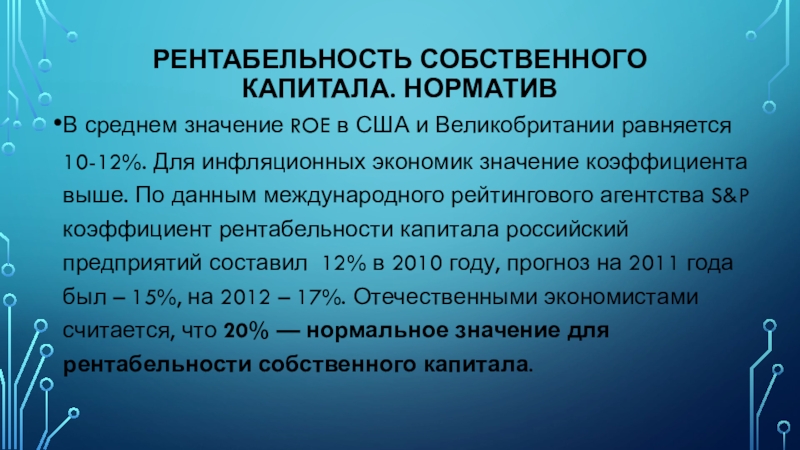 равняется 10-12%. Для инфляционных экономик значение коэффициента выше. По данным международного рейтингового агентства S&P коэффициент рентабельности капитала российский предприятий составил 12% в 2010 году, прогноз на 2011 года был – 15%, на 2012 – 17%. Отечественными экономистами считается, что 20% — нормальное значение для рентабельности собственного капитала.