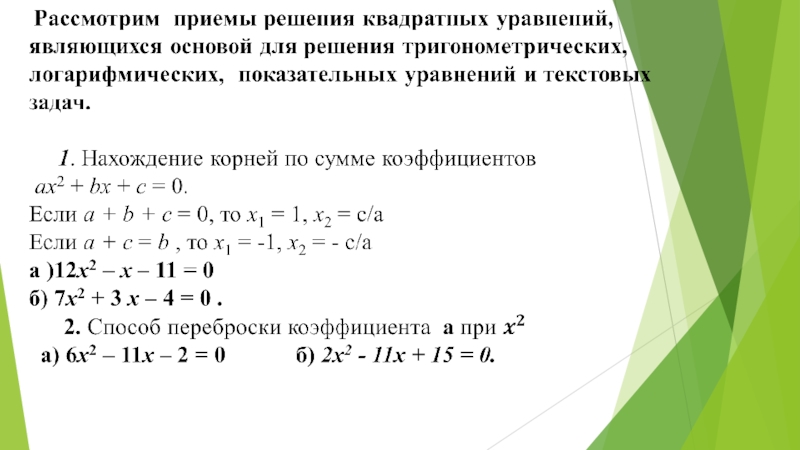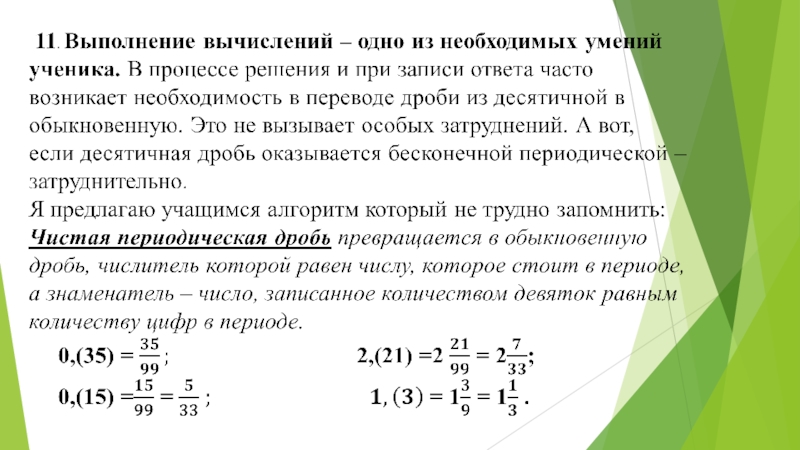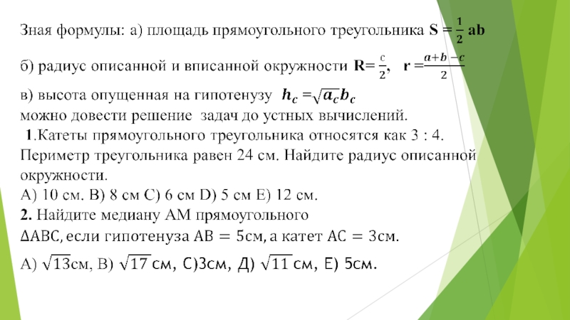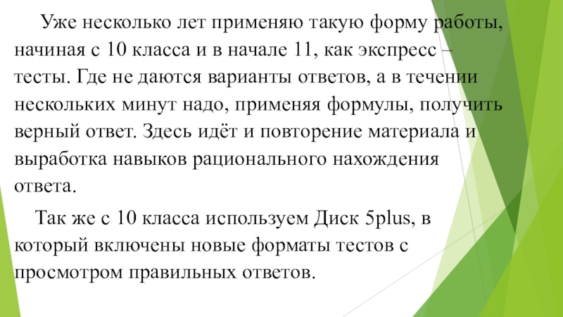 класса и в начале 11, как экспресс – тесты. Где не даются варианты ответов, а в течении нескольких минут надо, применяя формулы, получить верный ответ. Здесь идёт и повторение материала и выработка навыков рационального нахождения ответа.