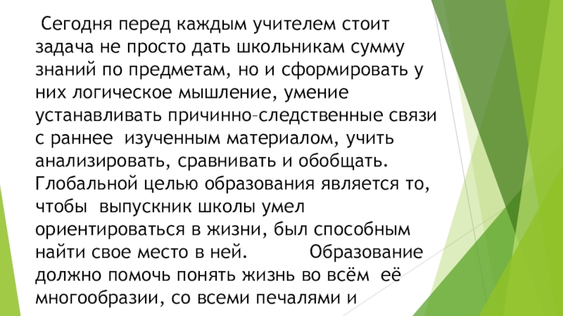 сумму знаний по предметам, но и сформировать у них логическое мышление, умение устанавливать причинно–следственные связи с раннее изученным материалом, учить анализировать, сравнивать и обобщать. Глобальной целью образования является то, чтобы выпускник школы умел ориентироваться в жизни, был способным найти свое место в ней. Образование должно помочь понять жизнь во всём её многообразии, со всеми печалями и радостями.