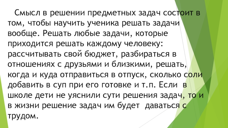 научить ученика решать задачи вообще. Решать любые задачи, которые приходится решать каждому человеку: рассчитывать свой бюджет, разбираться в отношениях с друзьями и близкими, решать, когда и куда отправиться в отпуск, сколько соли добавить в суп при его готовке и т.п. Если в школе дети не уяснили сути решения задач, то и в жизни решение задач им будет даваться с трудом.