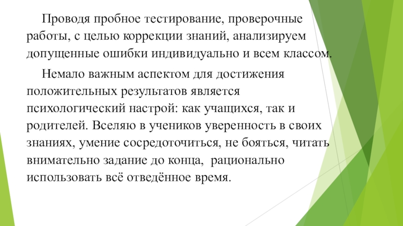 Немало важным аспектом для достижения положительных результатов является психологический настрой: как учащихся, так и родителей. Вселяю в учеников уверенность в своих знаниях, умение сосредоточиться, не бояться, читать внимательно задание до конца, рационально использовать всё отведённое время.