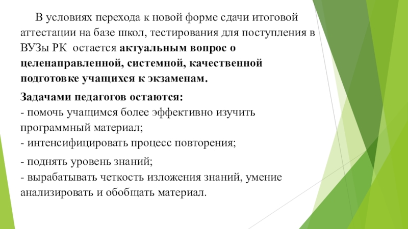 аттестации на базе школ, тестирования для поступления в ВУЗы РК остается актуальным вопрос о целенаправленной, системной, качественной подготовке учащихся к экзаменам.