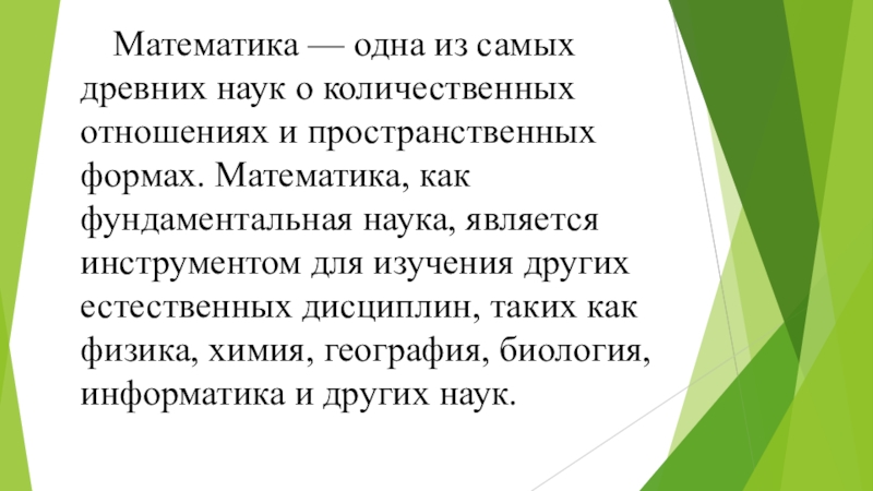 пространственных формах. Математика, как фундаментальная наука, является инструментом для изучения других естественных дисциплин, таких как физика, химия, география, биология, информатика и других наук.