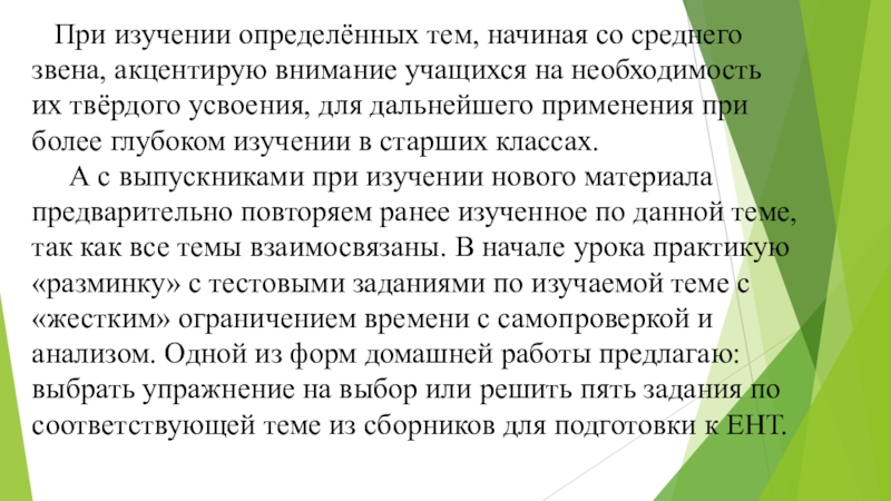 А с выпускниками при изучении нового материала предварительно повторяем ранее изученное по данной теме, так как все темы взаимосвязаны. В начале урока практикую «разминку» с тестовыми заданиями по изучаемой теме с «жестким» ограничением времени с самопроверкой и анализом. Одной из форм домашней работы предлагаю: выбрать упражнение на выбор или решить пять задания по соответствующей теме из сборников для подготовки к ЕНТ.