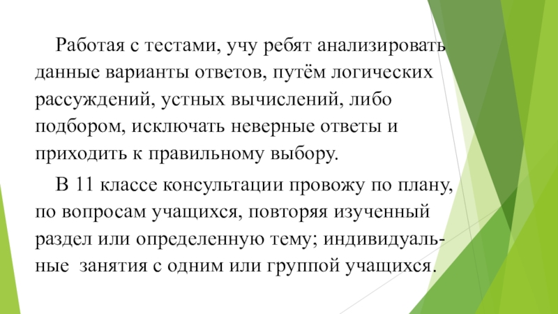 Слайд 12Работая с тестами, учу ребят анализировать данные варианты ответов, путём логических