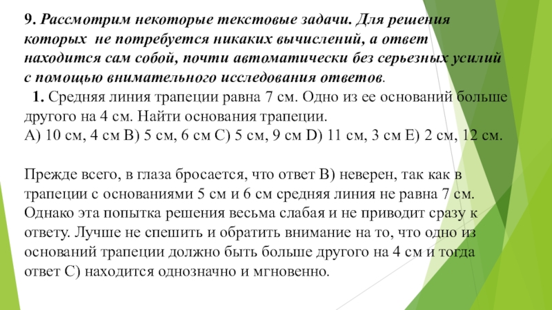 Прежде всего, в глаза бросается, что ответ В) неверен, так как в трапеции с основаниями 5 см и 6 см средняя линия не равна 7 см. Однако эта попытка решения весьма слабая и не приводит сразу к ответу. Лучше не спешить и обратить внимание на то, что одно из оснований трапеции должно быть больше другого на 4 см и тогда ответ С) находится однозначно и мгновенно.
