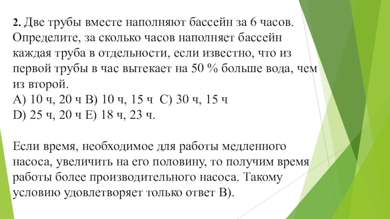 Слайд 202. Две трубы вместе наполняют бассейн за 6 часов. Определите, за