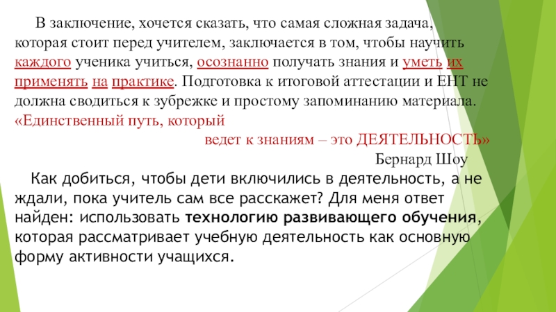 стоит перед учителем, заключается в том, чтобы научить каждого ученика учиться, осознанно получать знания и уметь их применять на практике. Подготовка к итоговой аттестации и ЕНТ не должна сводиться к зубрежке и простому запоминанию материала. «Единственный путь, который