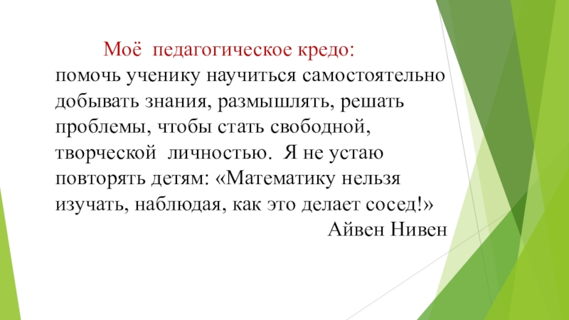 самостоятельно добывать знания, размышлять, решать проблемы, чтобы стать свободной, творческой личностью. Я не устаю повторять детям: «Математику нельзя изучать, наблюдая, как это делает сосед!»