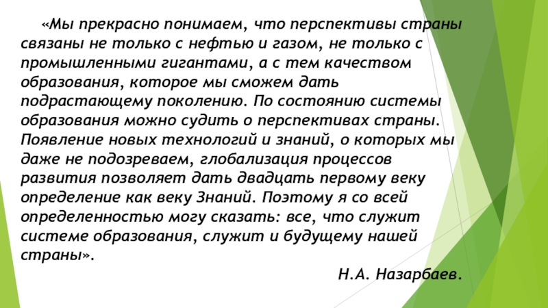 Слайд 2 «Мы прекрасно понимаем, что перспективы страны связаны не только с нефтью