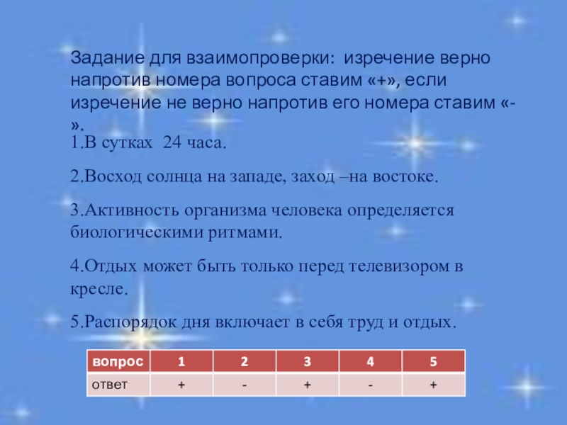Задание для взаимопроверки: изречение верно напротив номера вопроса ставим «+», если изречение не верно напротив его номера ставим «-».