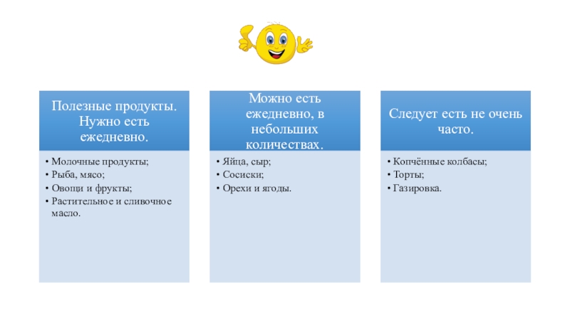 Полезно есть разные продукты: овощи и фрукты, молочные продукты, мясо и рыбу, хлеб и крупы, растительное и сливочное масло.